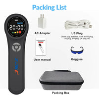 【Package Details of Low Level Therapy】 This red light phototherapy includes 1 * lllt laser therapy device+ 1 * AC Adapter with Charge Cable + 1 * Eye Protection Glasses + 1 * User Manual + 1 * product bags. More detail information, please see the product manual.If you have any questions about the red laser therapy device, please contact us. We are committed to providing you with satisfactory services.